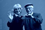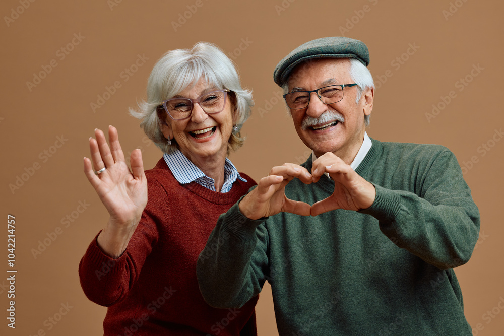Happy senior man making heart shape with hands while his wife is waving to camera.