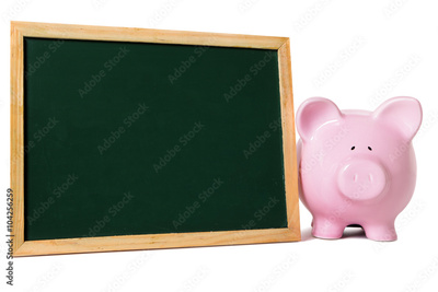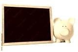 Piggy bank or piggybank in school or college classroom fees savings plan planning in front of small blank blackboard isolated on white background space for copy text photo