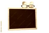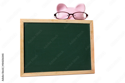 Piggy bank or piggybank wearing glasses in school or college classroom fees savings plan planning behind small blank blackboard isolated on white background space for copy text photo