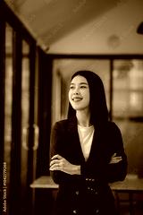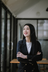 Professional Asian businesswoman using mobile phone and laptop in office