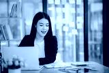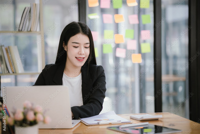 Image of Asian businesswoman working with laptop in home office. Beautiful woman sitting at desk, laptop, smartphone and documents on table.