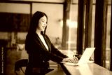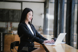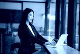 Beautiful Asian businesswoman talking on the phone using laptop in office