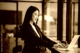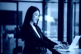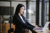 Beautiful Asian businesswoman talking on the phone using laptop in office