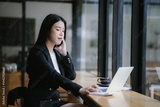 Beautiful Asian businesswoman talking on the phone using laptop in office