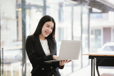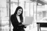Beautiful Asian businesswoman talking on the phone using laptop in office