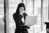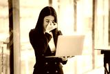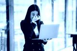 Beautiful Asian businesswoman talking on the phone using laptop in office