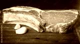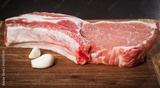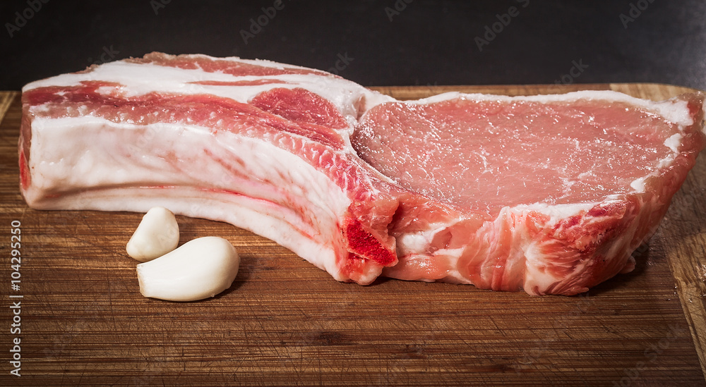 juicy piece of meat on the bone with a garlic lie on a wooden table.