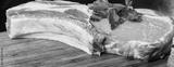juicy piece of meat on the bone with a parsley lie on a wooden table.