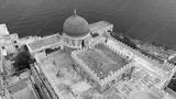 Aerial view of a Moorish palace with a sea view. There is a beautiful orange dome.