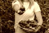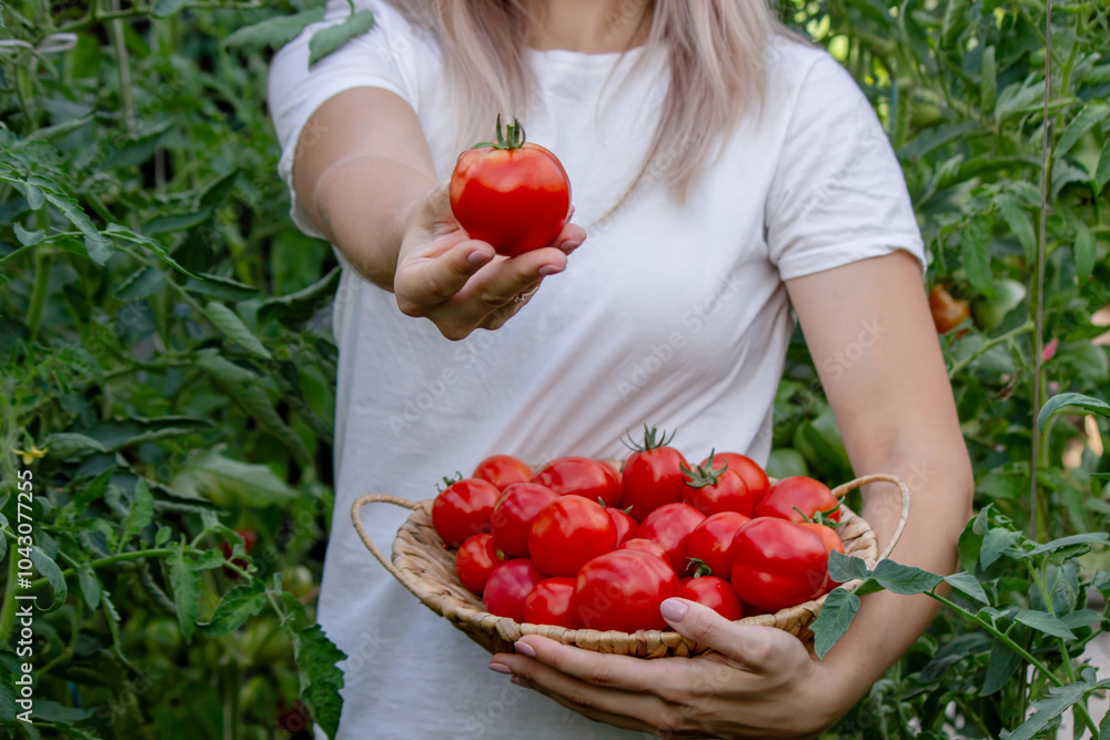 Female farmer holding fresh tomatoes in her hands. Selective focus
