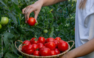 Female farmer holding fresh tomatoes in her hands. Selective focus