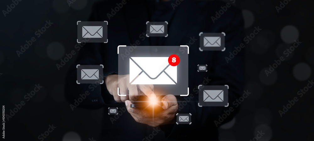 Businessman using smartphone check electronic mail with email icon on dark background.