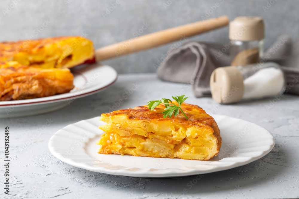 Spanish omelette with potatoes, typical spanish cuisine on gray concrete floor. Tortilla Espanola. Turkish name; Yumurtali patates