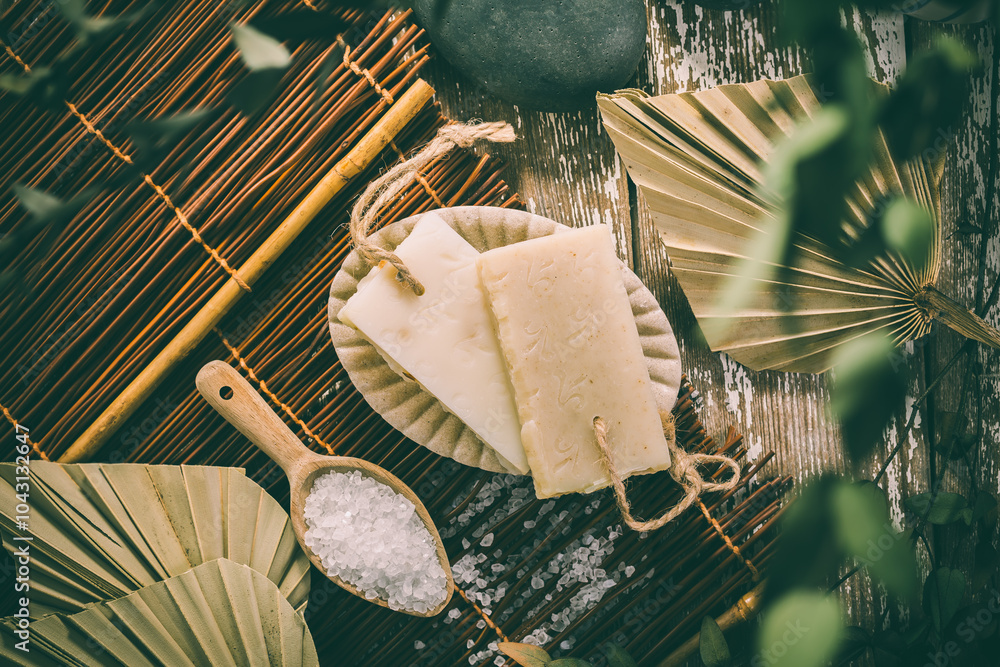 Organic handmade soaps, bath salt, wellbeing and relaxation concept
