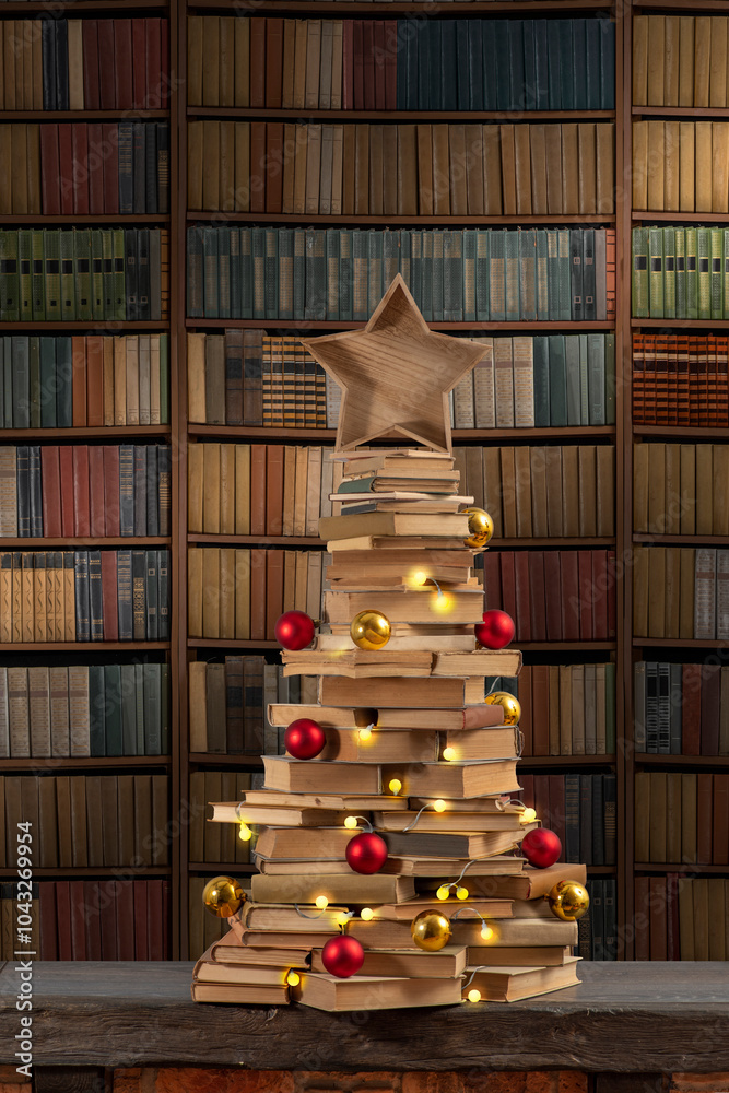 Christmas Tree from old books, lights, balls. New Year in the library with stacks of books, bookshelves. Literature for winter evenings during the holidays.