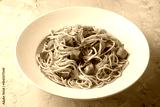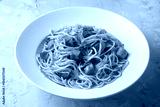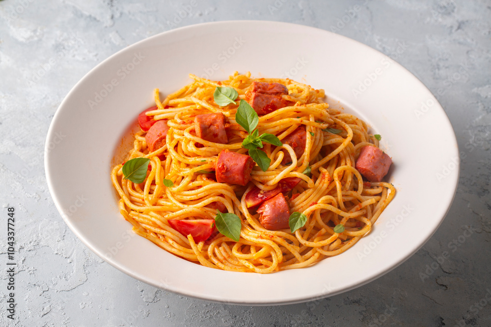 Hot dog or sausage stuffed with spaghetti in tomato sauce