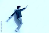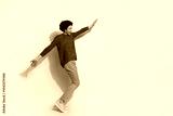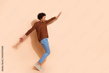 Happy young african american man in casual sweater and jeans posing joyfully on a beige background, expressing cheerfulness and energy.