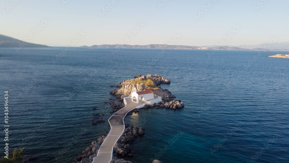 Authentic traditional Greek islands- unspoiled Chios, little church in the sea over the rocks Agios Isidoros. Eastern Aegean islands