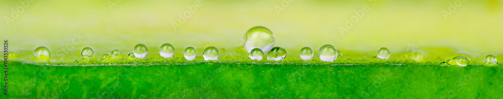 Macro drops of juice on green cucumber, Close up dew drop fresh vegetables, Long banner format