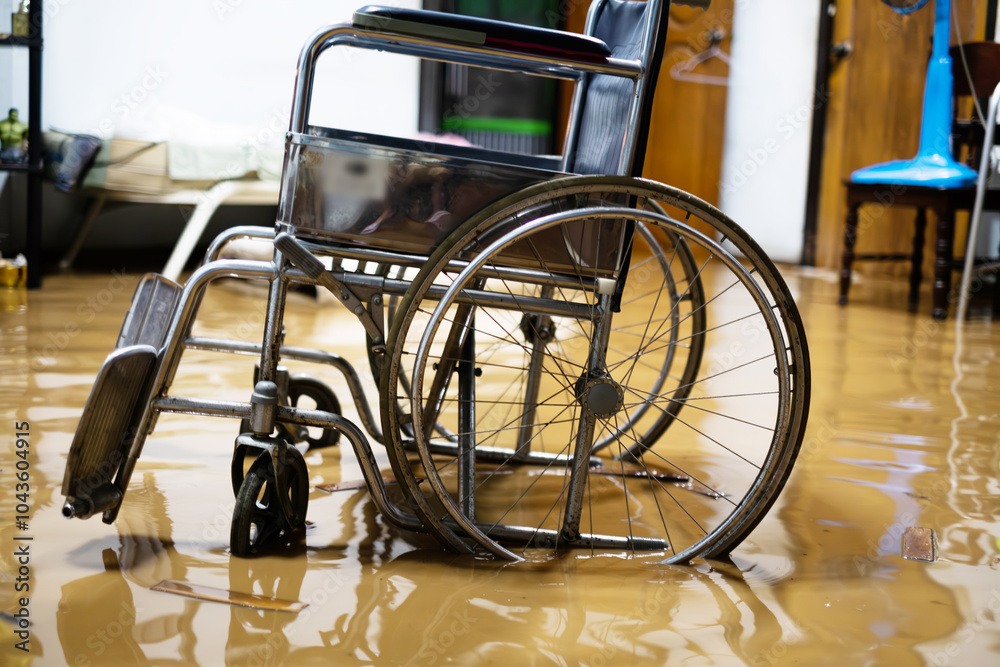 A wheelchair is sitting in a flooded room. The chair is in the middle of the room and is surrounded by water. The chair is tilted and he is in a state of disrepair. Scene is one of chaos