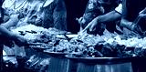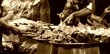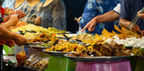 A group of people are gathered around a buffet table with a variety of food. Scene is lively and social, as people are enjoying each other's company and sharing food