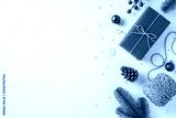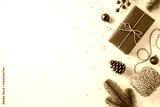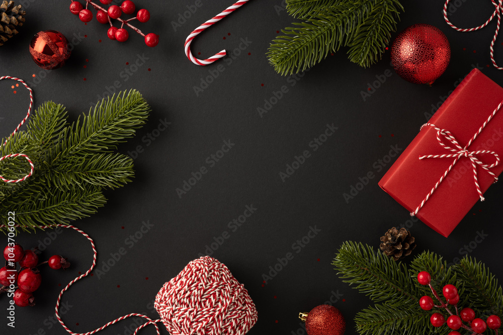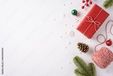 Top view of a red Christmas gift with decorations including pine cones, berries, and fir branches creating a festive holiday atmosphere