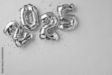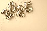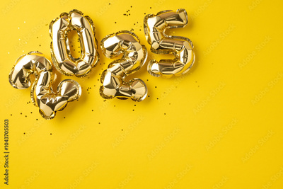 Festive golden number balloons forming 2025 against a bright yellow background, creating a celebratory and cheerful atmosphere