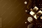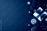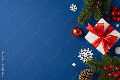 A beautifully wrapped Christmas gift box with a vibrant red ribbon surrounded by snowflakes, pine cones, and festive decorations on a blue background