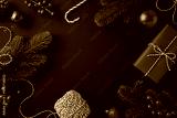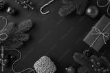 Top view of a festive Christmas arrangement featuring green branches, red berries, ornaments, and a wrapped gift on a dark background