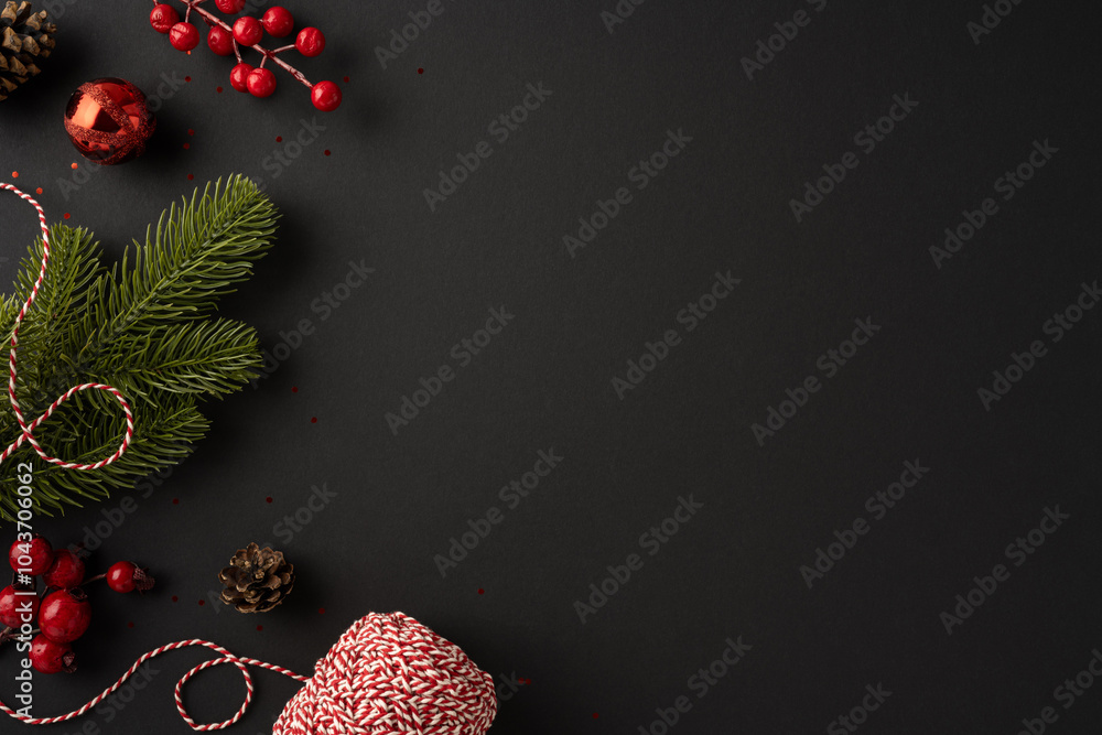 Festive Christmas arrangement featuring red bauble, pine branches, pinecones, and red berries on a dark background, evoking a warm and seasonal holiday atmosphere
