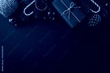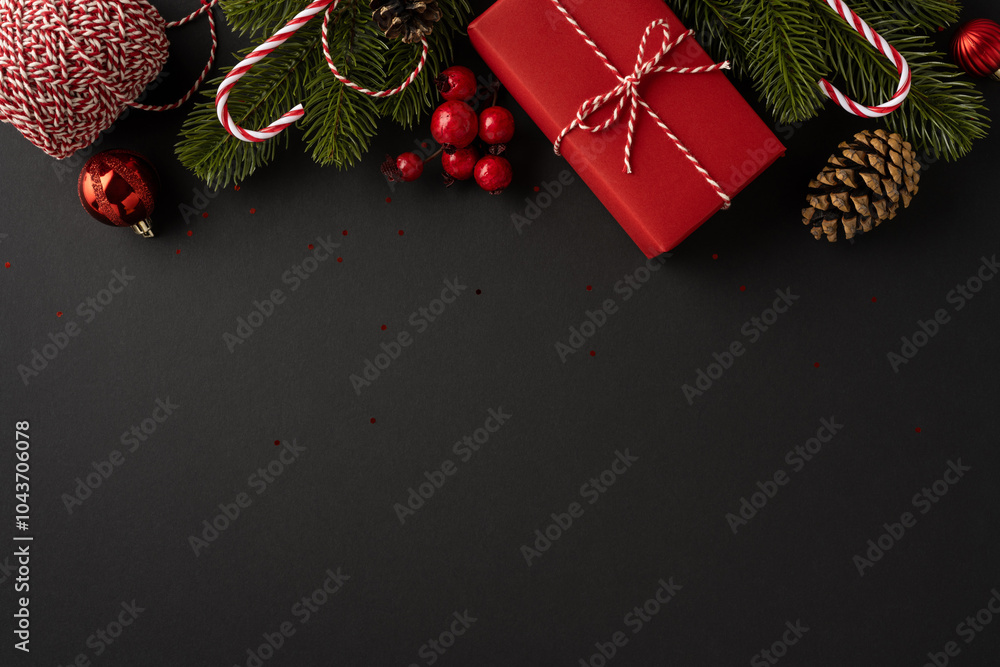 A top-down view of festive Christmas decorations featuring a wrapped gift, pine branches, red ornaments, and candy canes on a dark background creating a cheerful holiday atmosphere