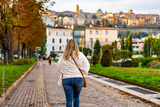 Long-haired blond woman wearing jeans, beige sweater, scarf and leather handbag walking along street in european city on autumn day, old town in distance. Back view