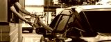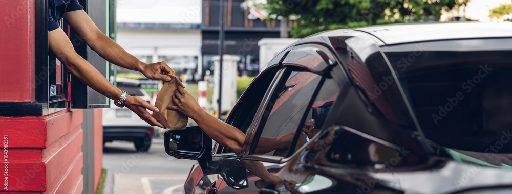 Hand Man in car receiving coffee in drive thru fast food restaurant. Staff serving takeaway order for driver in delivery window. Drive through and takeaway for buy fast food for protect covid19.