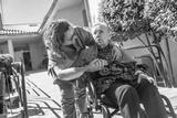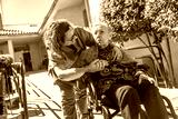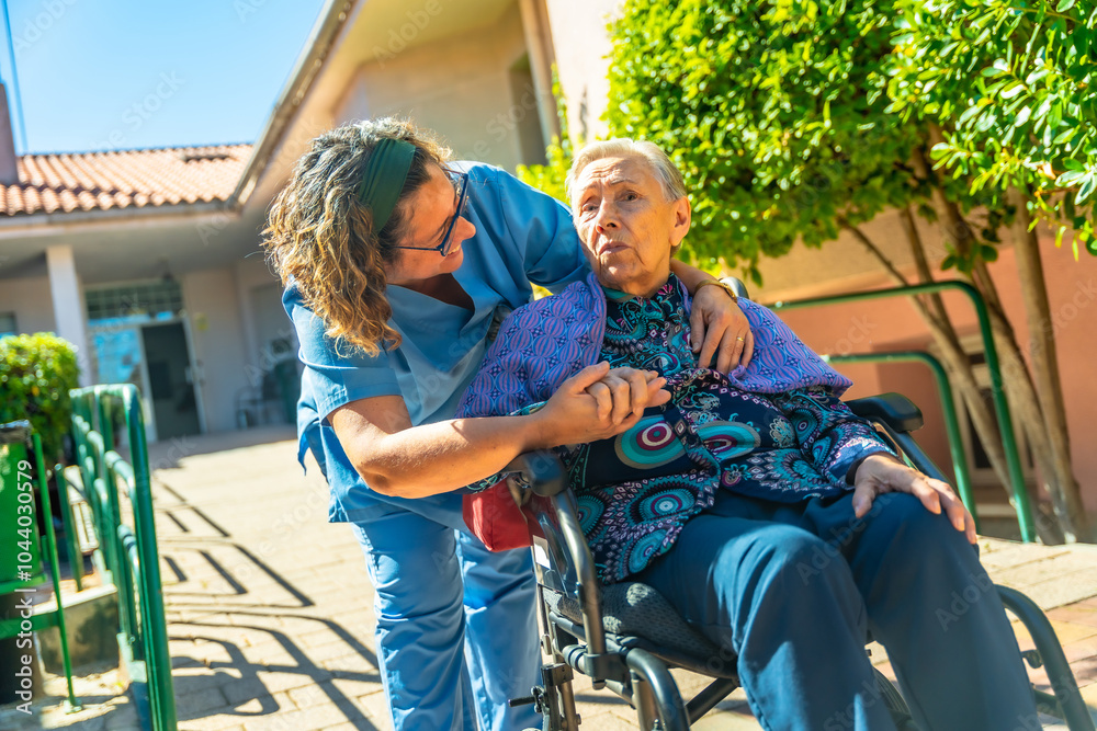 Tender nurse and senior woman in wheelchair outdoors the geriatrics