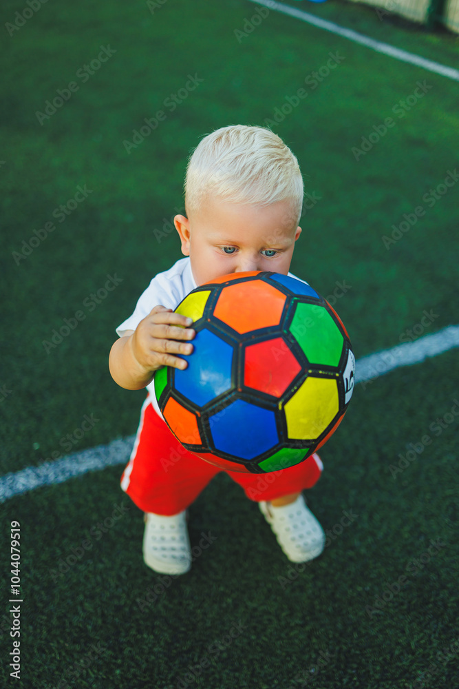 A one-year-old boy in a white T-shirt plays with a ball. TODDLER plays soccer. child development after one year