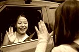 A caring and kind Asian mom is saying goodbye to her young daughter as she drops her off at school.