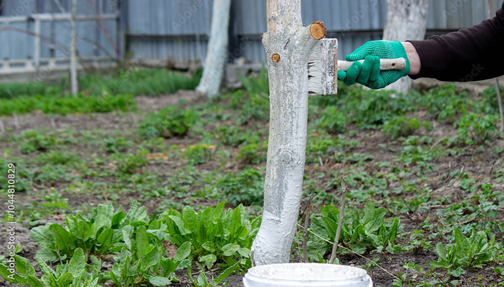 a man whitewashes trees in the garden in spring. Selective focus