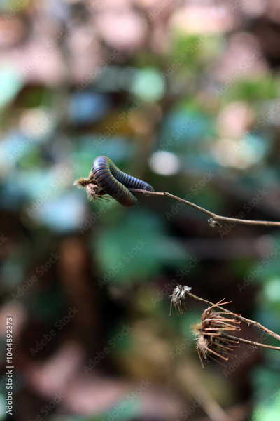 Black segmented Tachypodoiulus niger, european species of millipede on plant