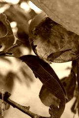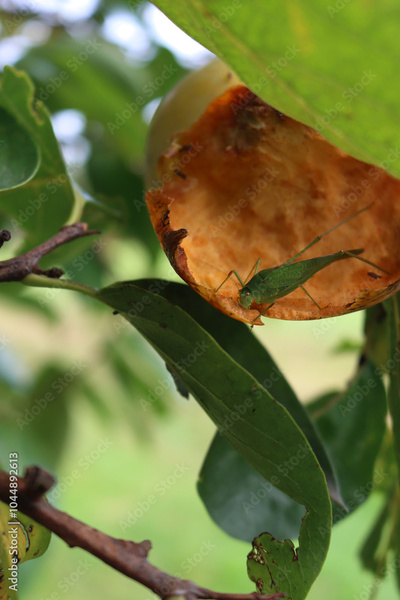 Close-up of green grasshopper on a Persimmon fruit in the orchard. Caelifera on Diospyros kaki