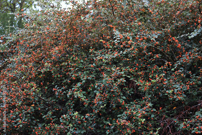 Close-up of big Cotoneaster franchetii bush with manry red berries on branches on autumn season