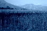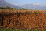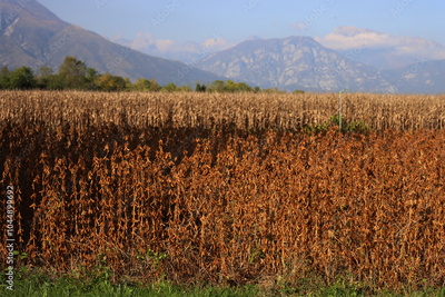Dry Soybean field ready to harvest on a sunny day. Cultivated Glycine max