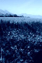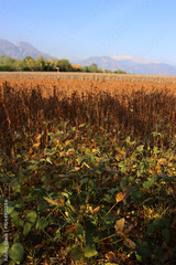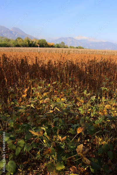 Dry Soybean field ready to harvest on a sunny day. Cultivated Glycine max