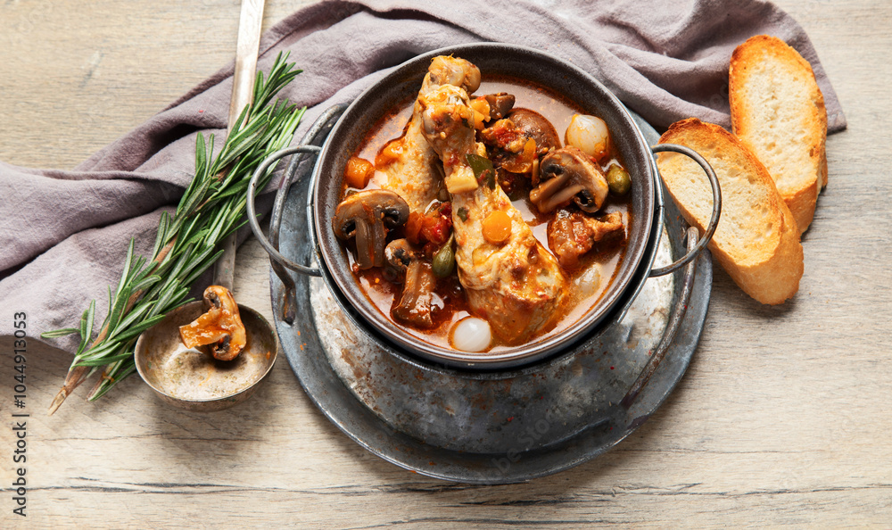 Coq au vin or rooster, cock with wine.