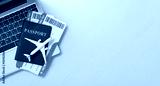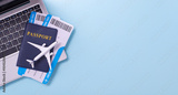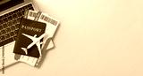 A flat lay of travel essentials including a passport, boarding pass, and a toy airplane on a laptop, symbolizing adventure and global travel
