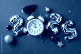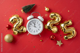 A festive New Year 2025 scene featuring an alarm clock surrounded by golden balloons and Christmas ornaments on a red background