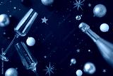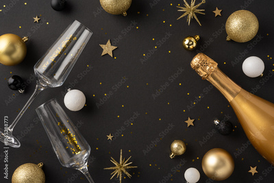 Celebrate the new year with champagne, golden decorations, and festive spirit. The image features two glasses and sparkling ornaments, creating an elegant holiday atmosphere
