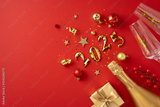 Celebrate the arrival of 2025 with sparkling champagne, festive decorations, and holiday cheer, all set against a striking red background for a joyful New Year’s occasion