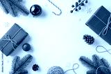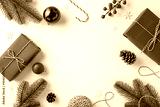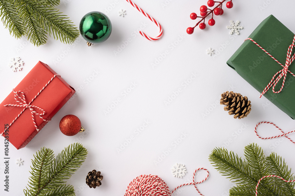 Festive top view Christmas scene featuring red and green wrapped gifts surrounded by decorations like pine cones, candy canes, and ornaments. Perfect for holiday themes and merry celebrations