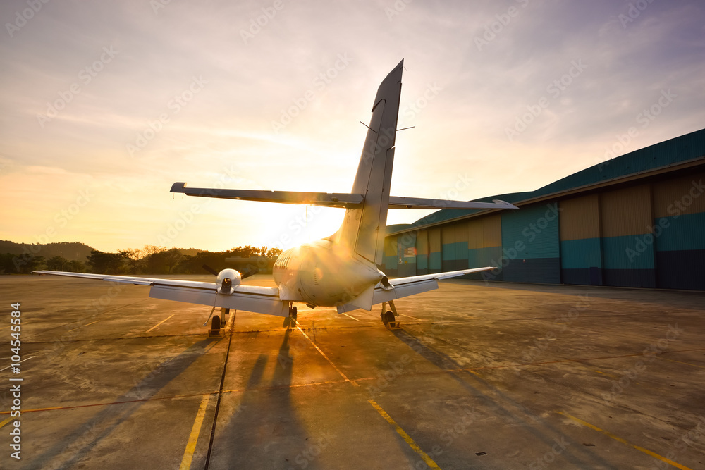 Small aeroplane infront of aircraft hangar during sunrise