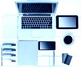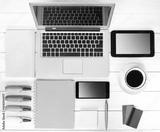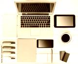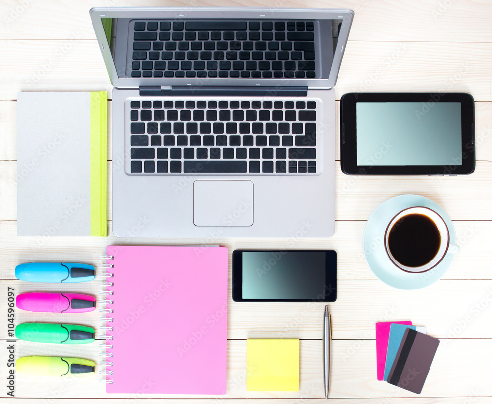 Gadgets on wooden background.Workplace upper view.